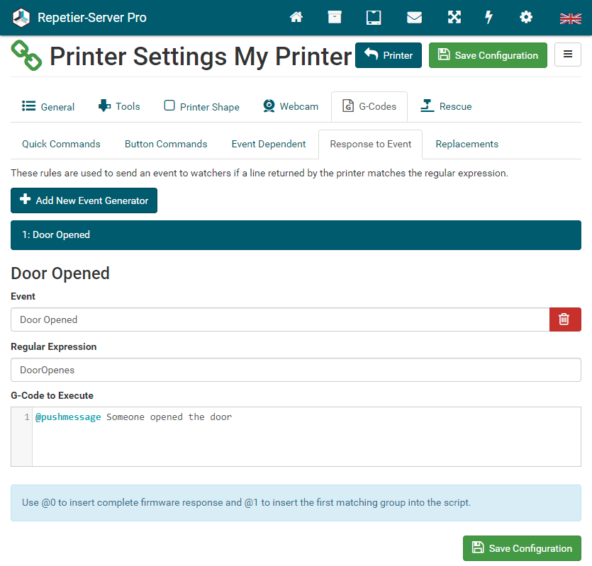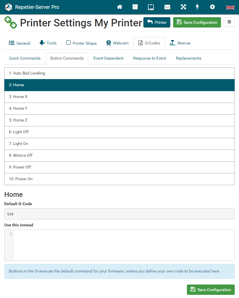G0 X<xpos> Y<ypos> Z<zpos> E<epos> F<feedrate>G1 X<xpos> Y<ypos> Z<zpos> E<epos> F<feedrate>G4G10 S<1 = long retract, 0 = short retract = default>G11 S<1 = long retract, 0 = short retract = default>G20G21G28G29 S<0..2>G30 P<0..3>G31G32 S<0..2> P<0..1>G90G91G92G131G132G133G134 Px Sx ZxG201 P<motorId> X<pos>G202 P<motorId> X<setpos>G203 P<motorId>G204 P<motorId> S<0/1>M104M105M106M107M109M114M3M4M5M20M21M22M23M24M25M26M27M28M29M30 <filename>M32 <dirname>M42 P<pin number> S<value 0..255>M80M81M82M83M84M85M92M99 S<delayInSec> X0 Y0 Z0M104 S<temp> T<extruder> P1 F1M105 X0M112M115M116M117 <message>M119M140 S<temp> F1M163 S<extruderNum> P<weight>M164 S<virtNum> P<0 = dont store eeprom,1 = store to eeprom>M190M200 T<extruder> D<diameter>M201M202M203M204M205M206M207 X<XY jerk> Z<Z Jerk> E<ExtruderJerk>M209 S<0/1>M220 S<Feedrate multiplier in percent>M221 S<Extrusion flow multiplier in percent>M226 P<pin> S<state 0/1>M231 S<OPS_MODE> X<Min_Distance> Y<Retract> Z<Backlash> F<ReatrctMove>M232M233 X<AdvanceK> Y<AdvanceL>M251M280 S<mode>M281M300 S<Frequency> P<DurationMillis>M302 S<0 or 1>M303 P<extruder/bed> S<printTemerature> X0M320M321M322M323 S0/S1M340 P<servoId> S<pulseInUS>M350 S<mstepsAll> X<mstepsX> Y<mstepsY> Z<mstepsZ> E<mstepsE0> P<mstespE1>M355 S<0/1>M360M400M401M402M408 S<0-5>M450M451M452M453M460 X<minTemp> Y<maxTemp>M500M501M502M513M600M601 S<1/0>M602 S<1/0> P<1/0>M603M604 X<slowdownSteps> Y<errorSteps> Z<slowdownTo> T<extruderId>M908 P<<address> S<value>M999We offer manufacturers and vendors the possibility to create a custom branding for Repetier-Server with own name, logo and colors and to distribute this customized version to their customers. For this a license code is required in any case. On request we offer licence codes for resellers at reduced rates.