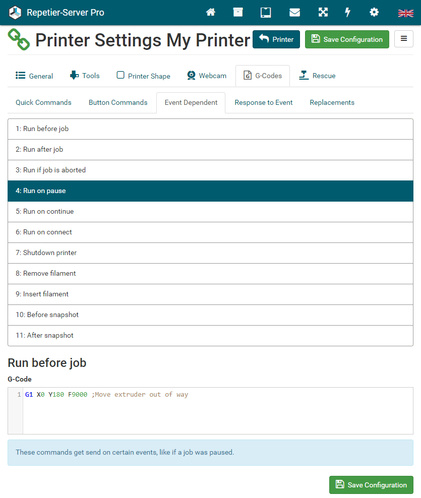 Sometimes you might want to initate actions at special positions of the G-Code beeing send. To allow this, you can add server commands inside the code. Server commands start with @ or ;@. Use the latter if the code should also woek without the server. Then it would be handled as a simple comment and gets ignored. You can also send these commands over the console panel.